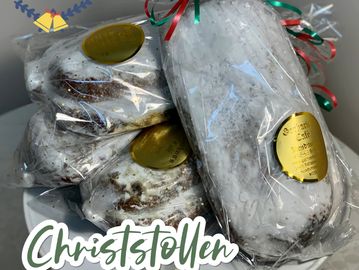 Traditional German Christmas bread made with dried fruits, candied peel, nuts and spices. Top covered with marzipan